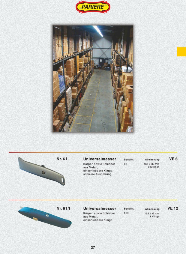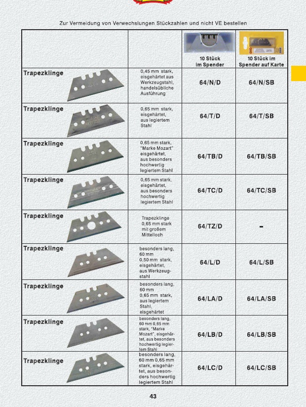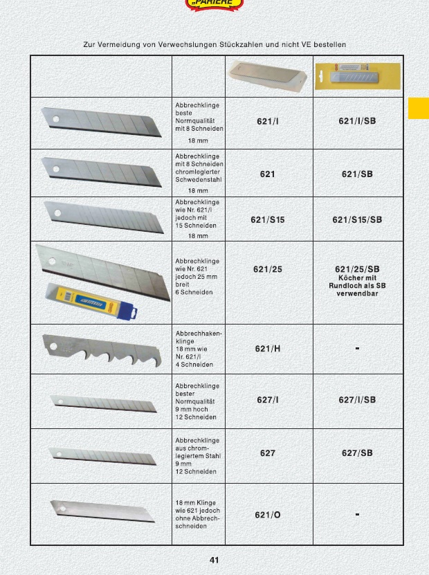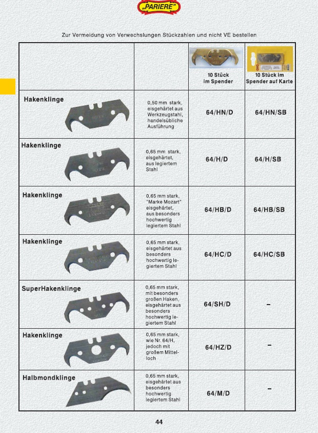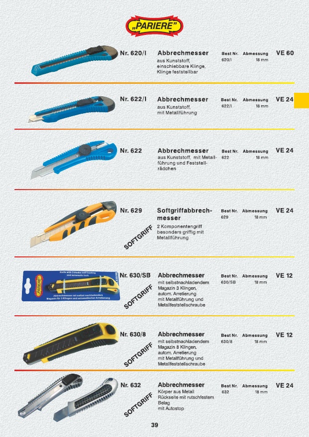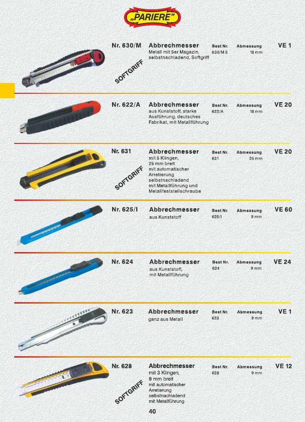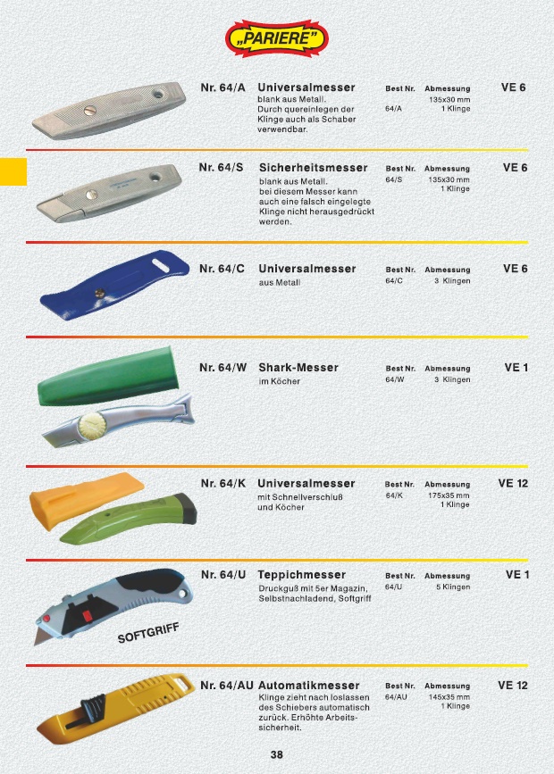 Universalmesser, Softgriffuniversalmesser, Sicherheitsmesser, Shark-Messer, Teppichmesser, Automatikmesser, Abbrechmesser, Softgriffabbrechmesser, Abbrechklinge, Abbrechhakenklinge, Ersatzklinge, Trapezklinge, Hakenklinge, Superhakenklinge, Halbmondklinge